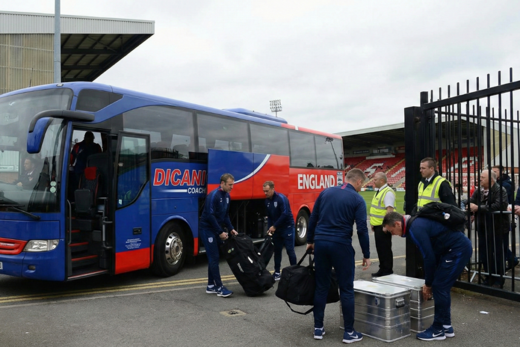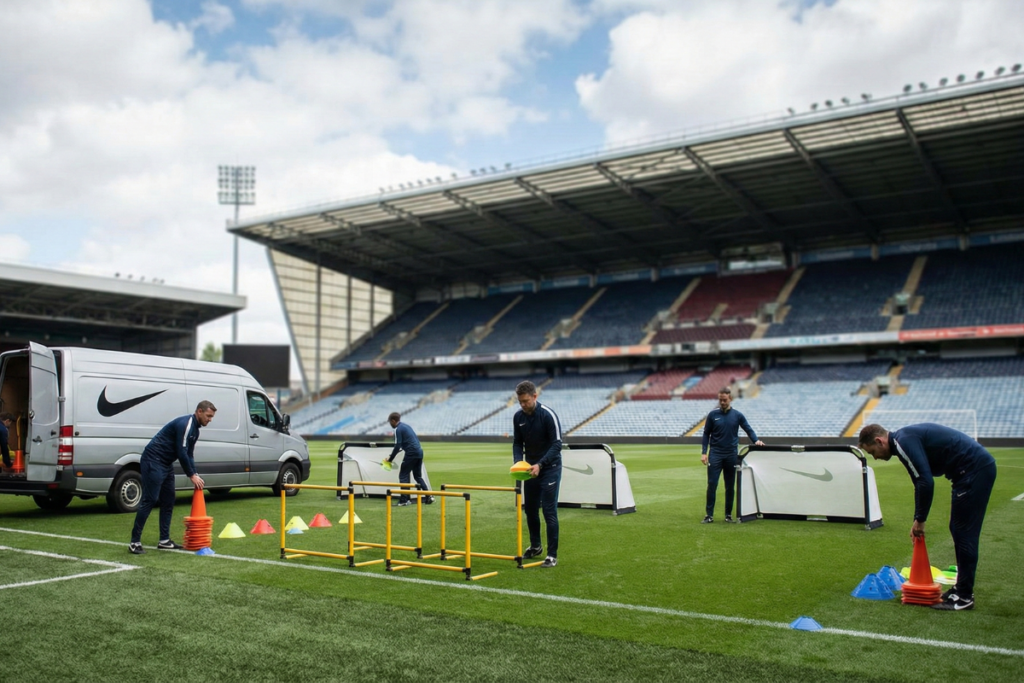 - Équipement de stade : Buts, filets, poteaux de corner, abris de touche – ce matériel lourd est commandé, transporté et installé selon des normes de sécurité et de compétition très précises (FIFA, UEFA).